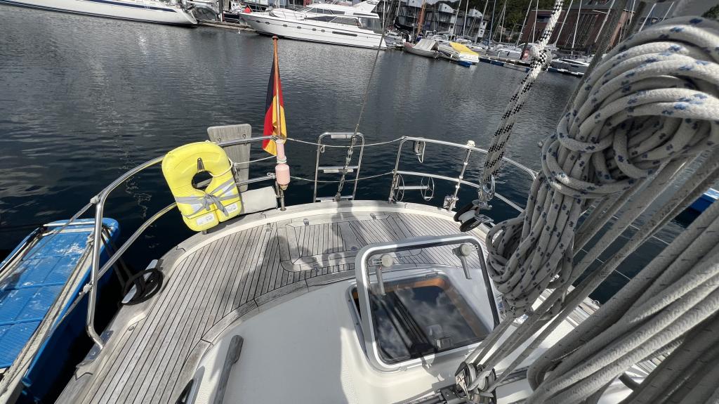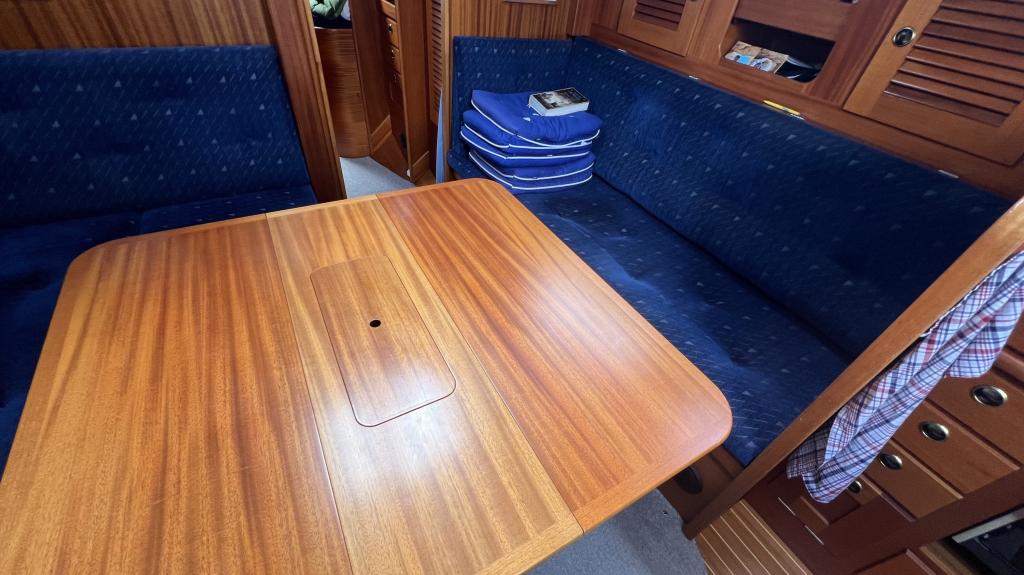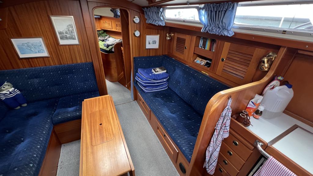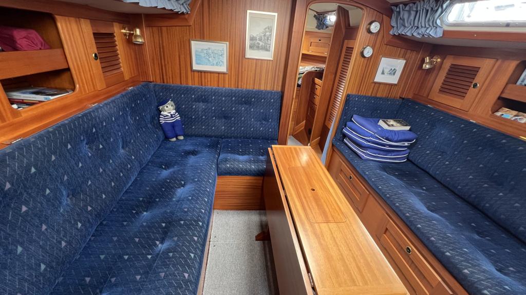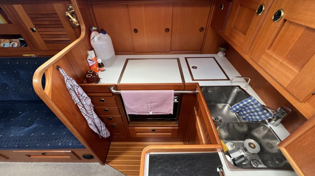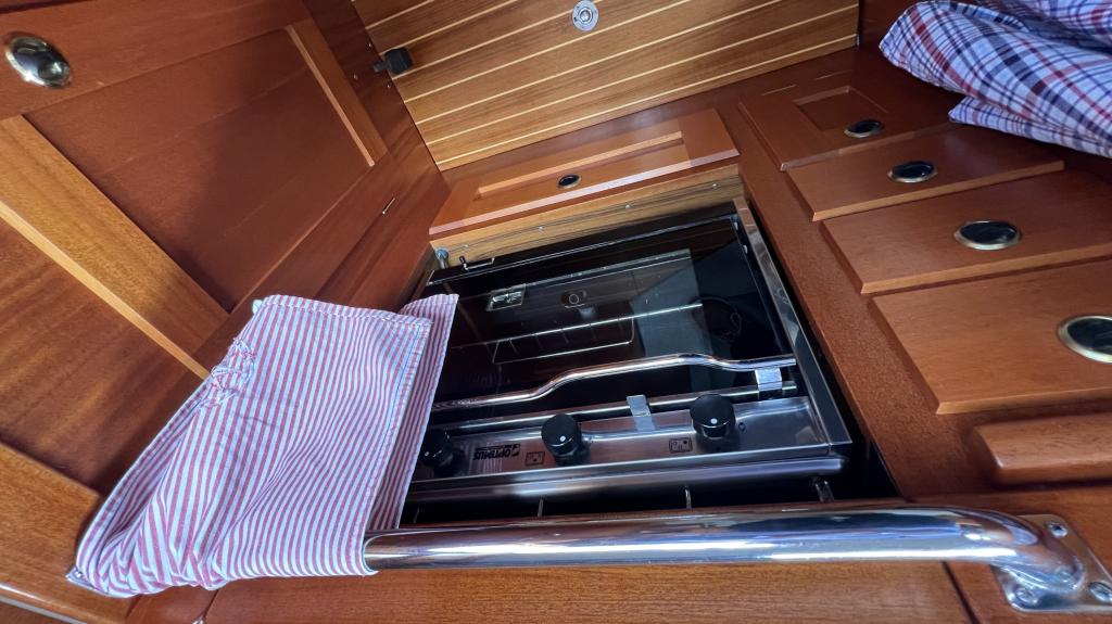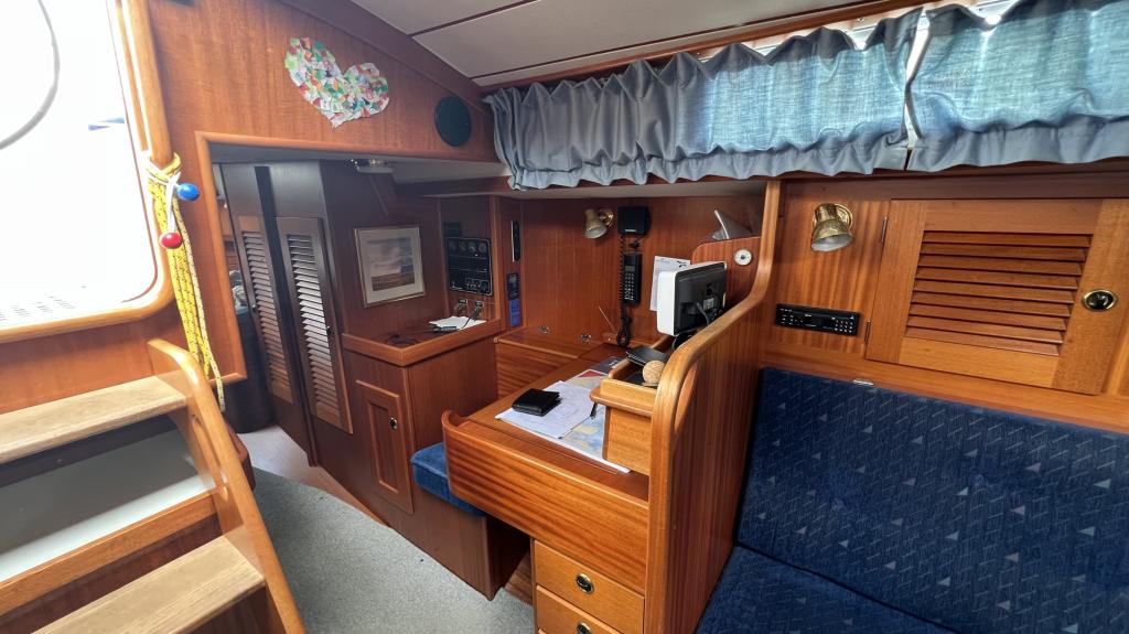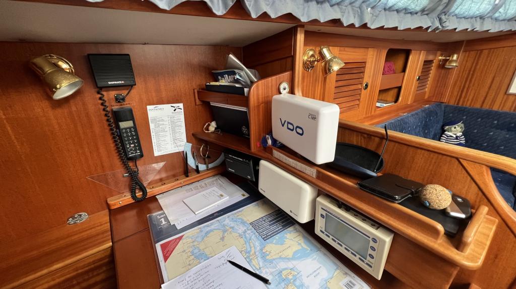 Es ist komplett Ausgestattet, neben dem ganzen Geschirr sind auch Handbücher und Seekarten mit an Board.