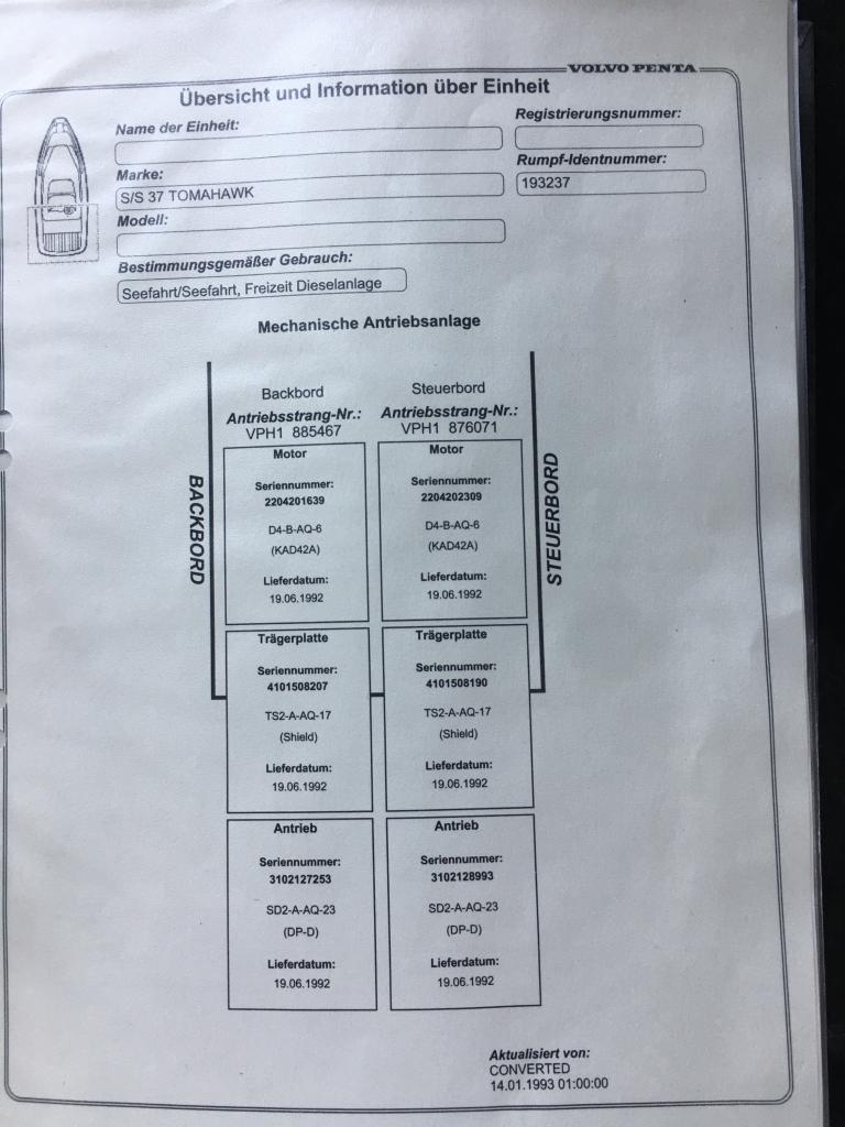 - 2 Diesel Motoren Volvo Penta KAD 42 A aus dem Jahr 1992, ca. 650 Betriebsstunden, jeweils 230 PS
