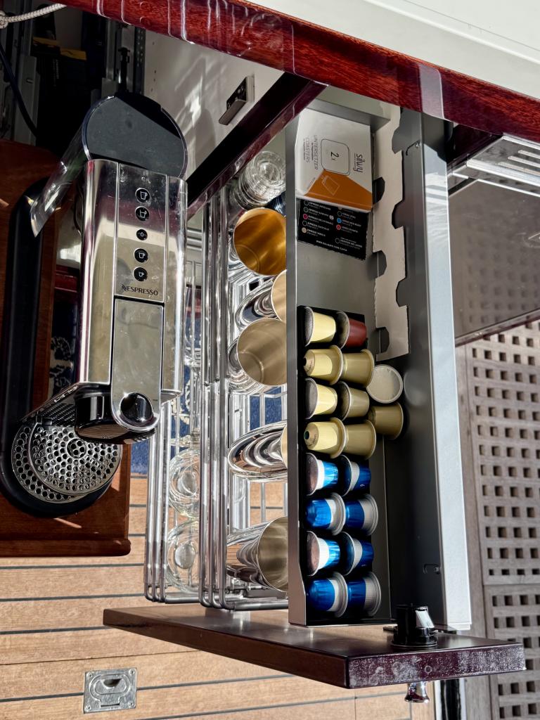 The functional galley is positioned on starboard side of the salon, fully equipped with modern appliances such as a Nespresso coffee machine on a convenient pullout drawer, refrigerator, stove, and ample storage space.
