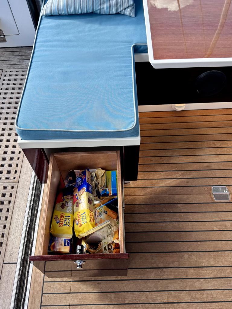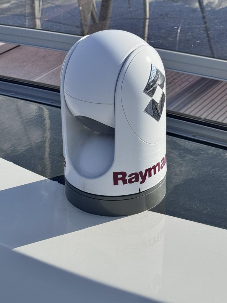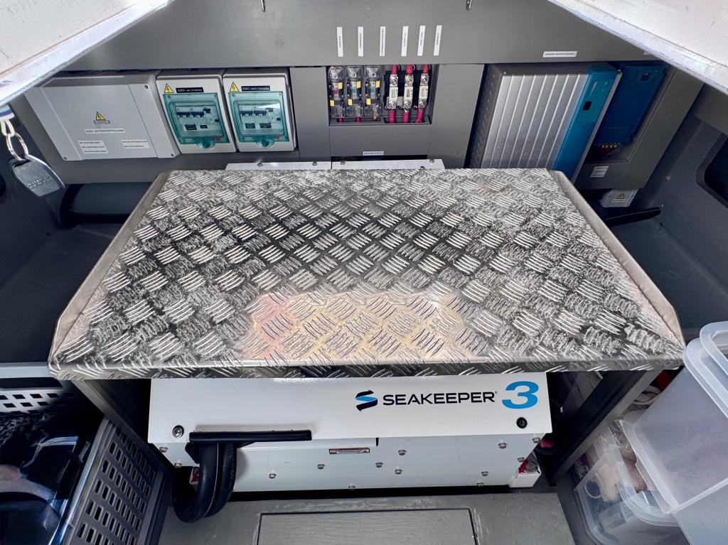 The galley is equipped with a Zanussi induction hob, an Isotherm fridge, a sink, a Nescafé machine, and dedicated storage for cutlery, plates, and glasses. All side and aft windows are protected by rectractable shields and the glass door aft is foldable.