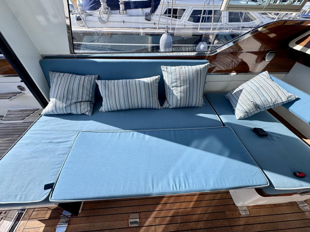 The hydraulic table easily transforms the seating area into a large lounge sofa. A special feature is the retractable roof, fitted with solar panels connected to a dedicated ventilation system that keeps the boat cool when unattended.