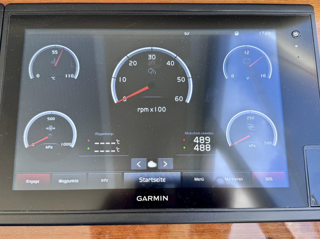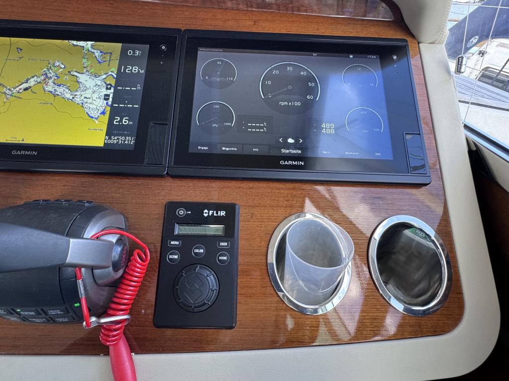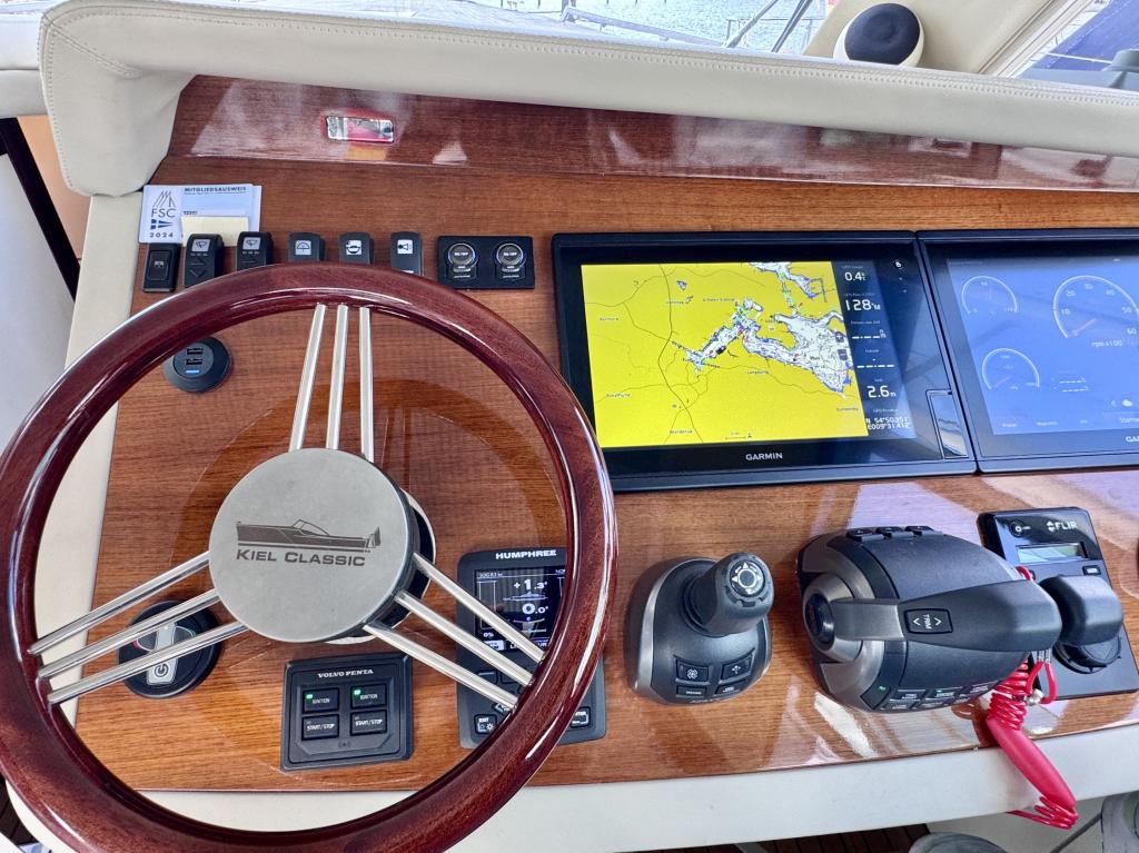 The helm station of the Kiel Classic features wooden steering wheel, Garmin plotter displays, Joystick for easy handling, Bowthruster, Humphrees,