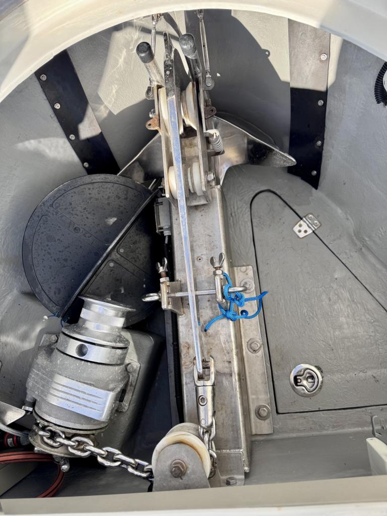 Die 35 Meter lange Edelstahlkette garantiert starke Haltekraft und Korrosionsbeständigkeit. Der Ankerkasten ist selbstlenzend, was Wartung und Reinigung vereinfacht. Edelstahlbeschläge und Ankerführung unterstreichen die elegante Linienführung und Robustheit der Yacht.