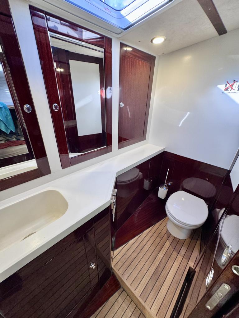 Adjacent to the guest cabin is a well-appointed head equipped with modern amenities for convenience and comfort. This includes an electric flush toilet and a separate shower stall, both designed for privacy and ease of use. The head is finished with contemporary fixtures, adequate ventilation, and lighting to ensure a pleasant experience.