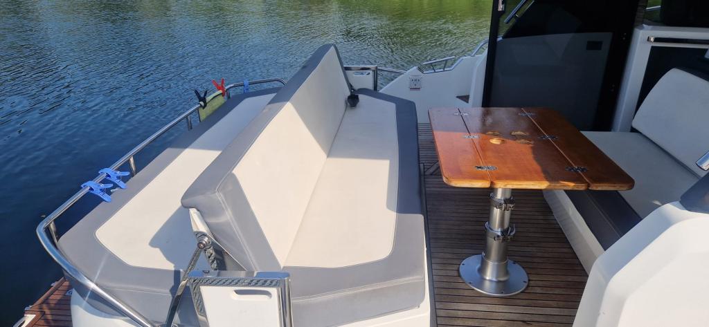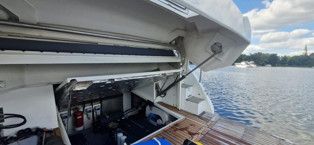 Sofa im Heckcockpitbereich mit Stauraum Serviceluke für die Motoren in der Tendergarage Komplettes Schmutzwassersystem mit elektrischen Toiletten