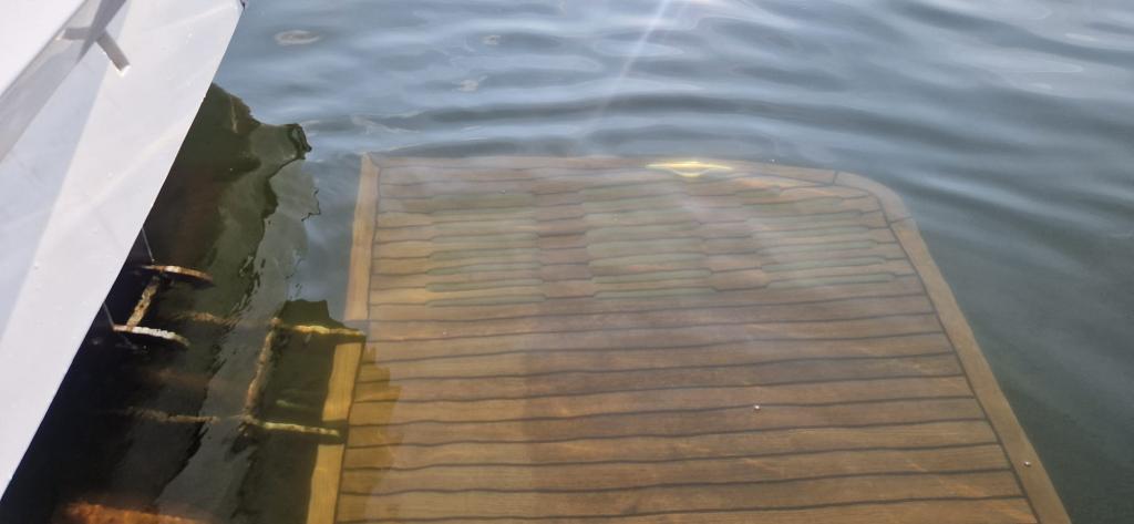 Teak im Cockpit Hydraulische Badeplattform mit Teak Ambiente LED Beleuchtung Frontscheibenwaschanlage Frontscheibenpersenning und Seitenscheibenpersenning Fenderkörber in der Bugreling