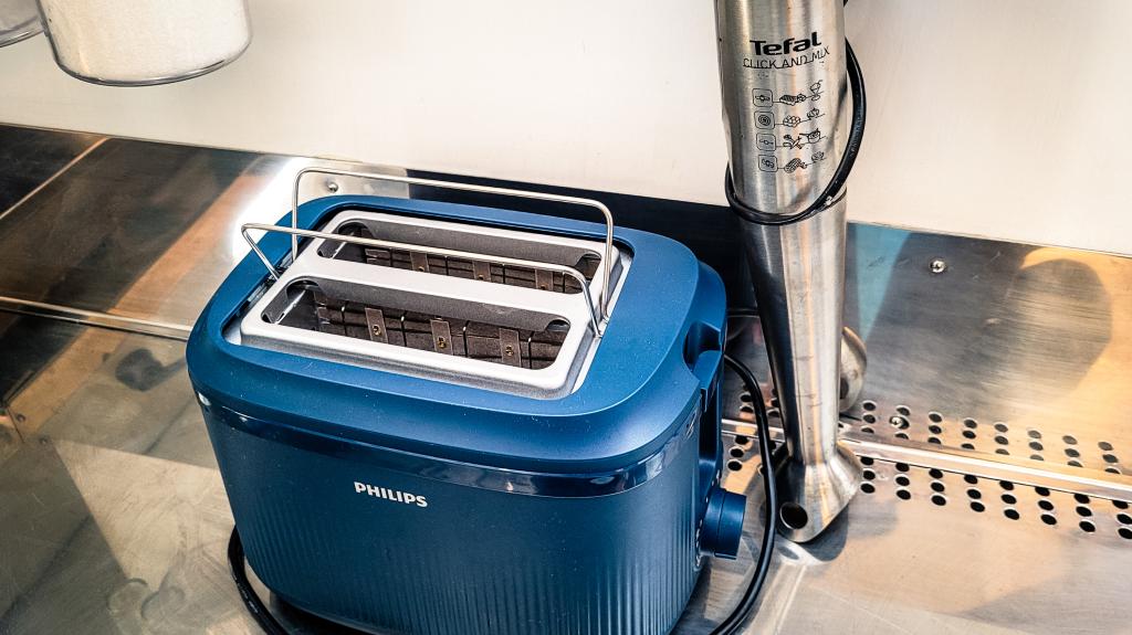 Kaffeemaschine, Geschirr und Toaster ausgestattet.